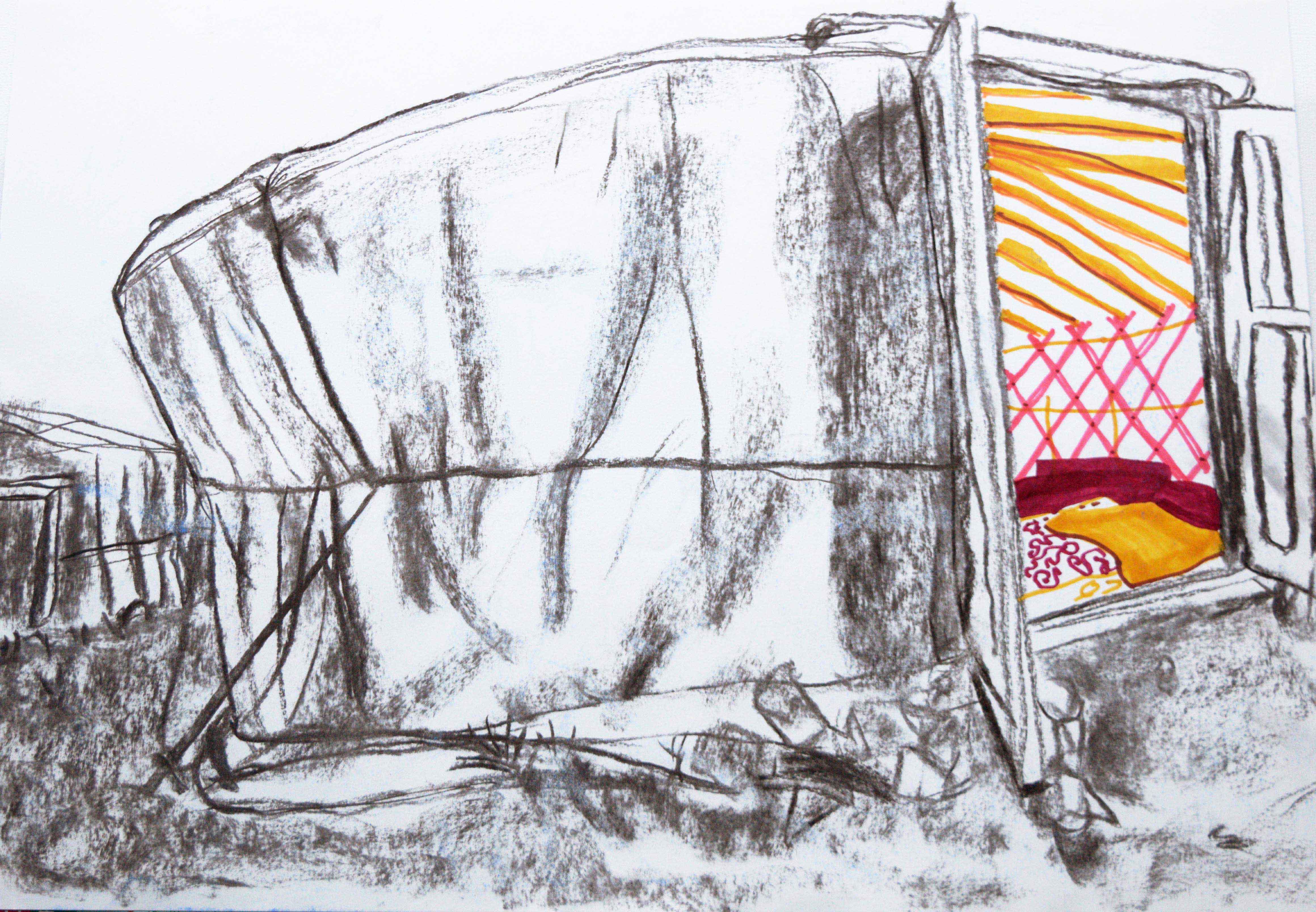 Anouk Van Hooydonk, "Yurts", houtskool & stift op papier, A3, 2019. Groepstentoonstelling & Horse & Art Artist Residency "HARP 2019" Barnag, Hongarije