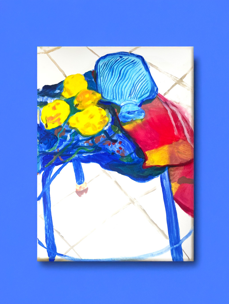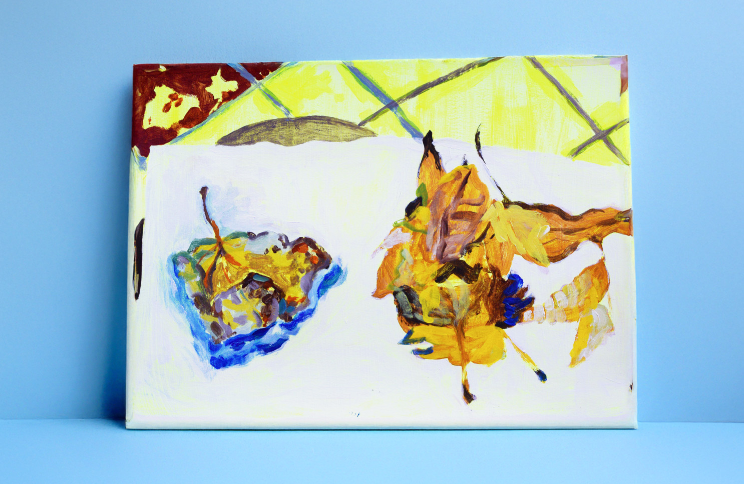 Anouk Van Hooydonk, “Stilleven met kweepeer en waterkruik“, oil & acrylic paint on paper, A3, 2025.