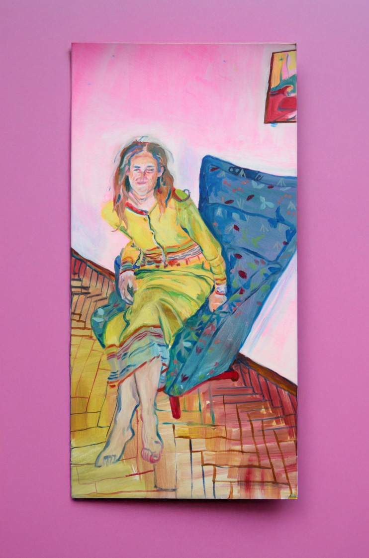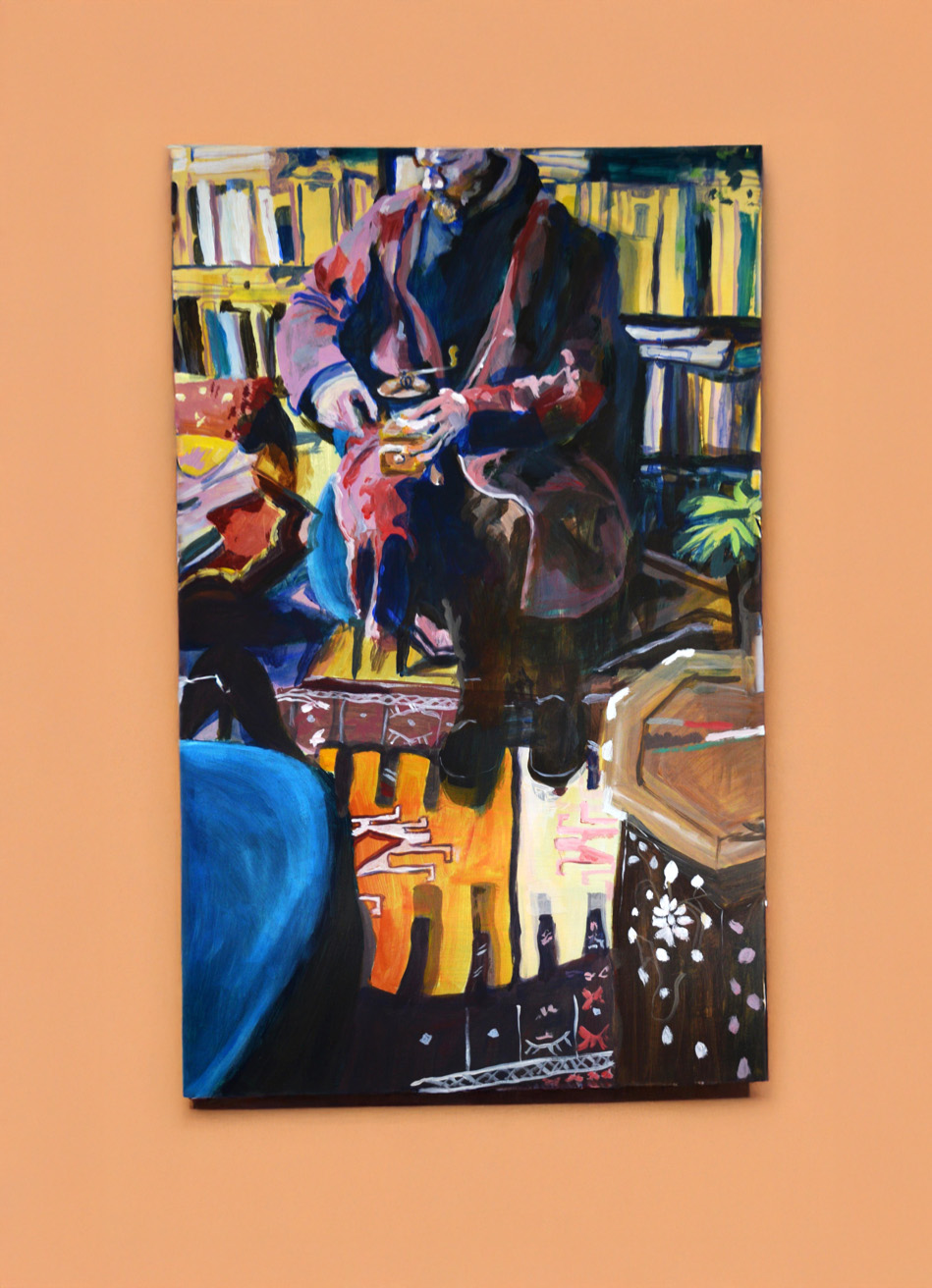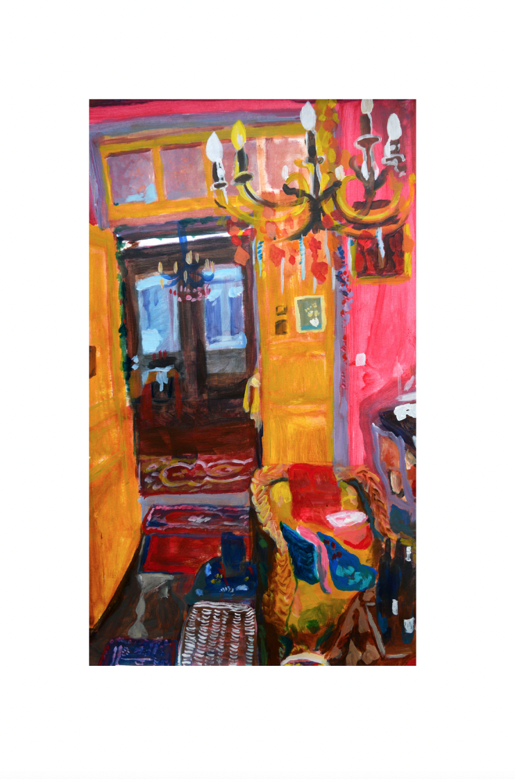 Anouk Van Hooydonk, « Op bezoek bij tante Marleen », acrylverf op papier, 2024-2025.