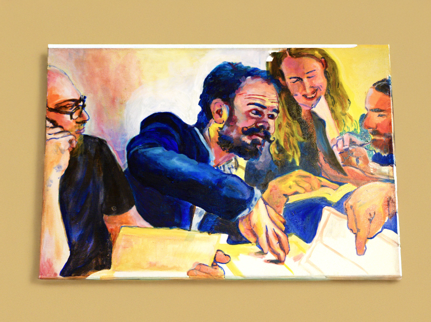 Anouk Van Hooydonk, Rechtvaardige rechters, acryl en gouache op paneel, 2021. Wedstrijd & Groepstentoonstelling "Op Eigen Hout" onder de Stadshal, Gent.