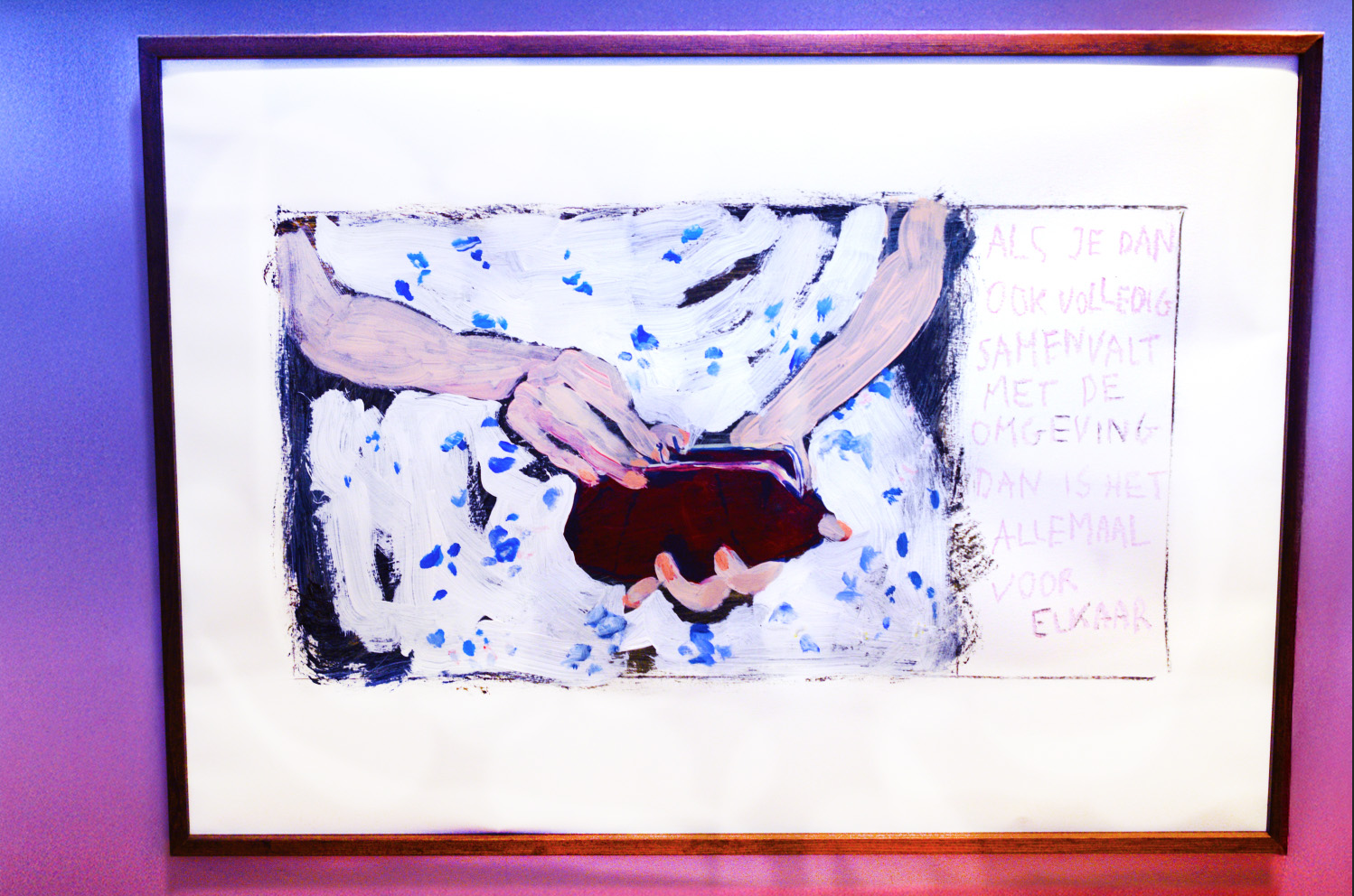 Anouk Van Hooydonk, "Als je dan ook volledig samenvalt met de omgeving, is het allemaal voor elkaar", schilderij op papier, 2024.